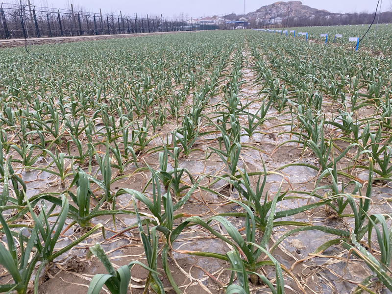 据田间观察,受当前断崖式寒潮天气影响,刚返青的蒜叶表面有冰晶现象,叶片出现水浸状,叶片挺直无弹性,叶色渐暗绿,有明显的冻害症状。另据气象部门预测,本月下旬仍以低温、雨雪、冰冻天气为主,冻雨和积雪相对融化较慢,预判对大蒜土传病虫害及后期收获产量影响较大。